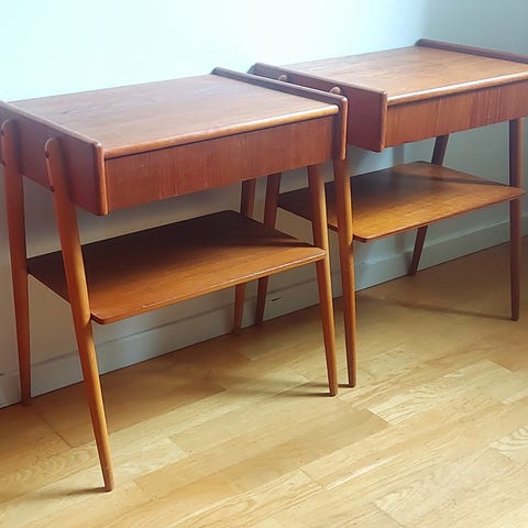 2 stycken sängbord i ek faner med låda. Bredd: 45 cm, Höjd: 55 cm, Djup: 33 cm
