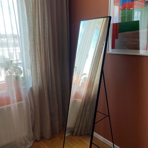 Golvspegel från IKEA med helkroppsspegel och svart metallställning. Har dekorativt mönstrad metall på baksidan och kan vinklas efter behov.
