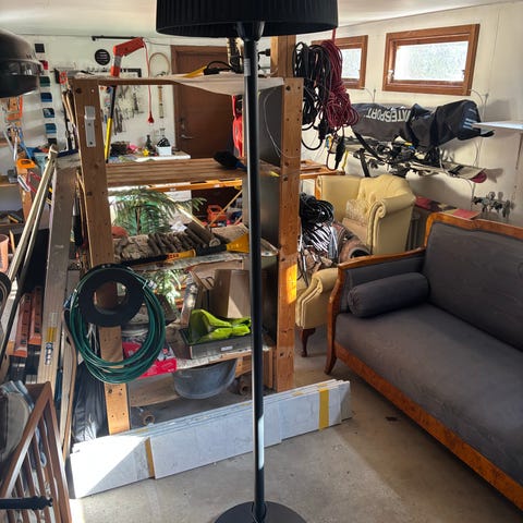Svart golvlampa med flätad skärm som ger ett fint ljus runtom. Står på rund fot och har sladd med strömbrytare nere vid golvet.