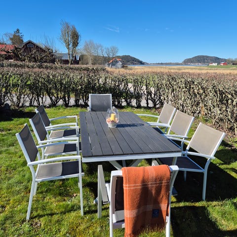 Matgrupp för altan med svart bord och 8 stolar med hög rygg. 2 av stolarna är helt nya (är ej med på bild)