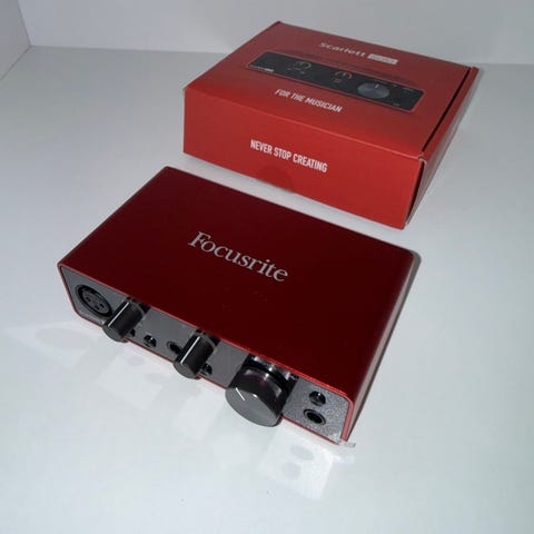 Säljer nu min Focusrite Scarlett Solo 3rd gen USB-ljudkort. Inköpt i December 2025 och använd kanske 4-5 gånger. Plasten vid knapparna och vreden är till och med kvar. USB kabel ingår.