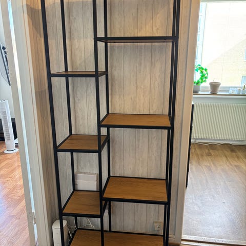 Svart hylla från IKEA med metallstomme och glasplan i mitten. Nedersta planet är i mörkt trä och möbeln är öppen på alla sidor så den är lätt att komma åt från båda håll.