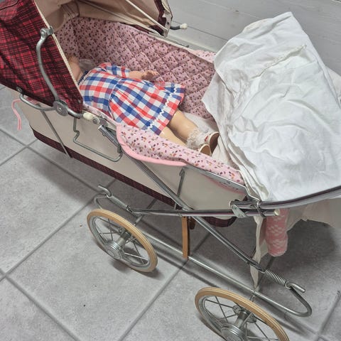 En liggvagn och en sittvagn till dockor från 1960-70-tal. I hyfsat skick men med en reva på liggvagnen och en lite knycklad fotbräda på sittvagnen.