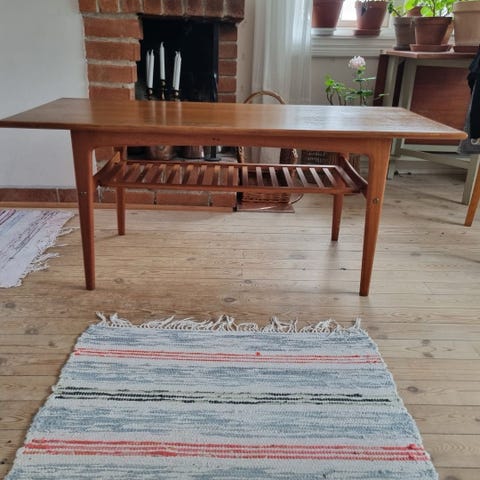Bord i teak med skiva klädd i konstskinn. Längd 110 cm. Djup 56 cm. Höjd 61 cm.