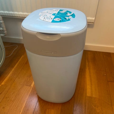 Blöjhink från Tommee Tippee i vit och grå med svart lock. Har öppningsbart lock upptill och insats med hållare för påsar med lucka som stängs för att hålla ute lukt.