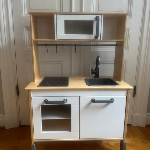 Leksakskök från IKEA med spisplattor, diskho och kran. Har skåp, hylla och stång med köksredskap som kan hängas upp.