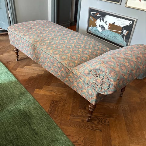 Silverfärgade svarvade ben, tyg från Roma som skiftar beroende på hur ljuset faller, och har lite glans. Randigt i vinrött, guld och beige.