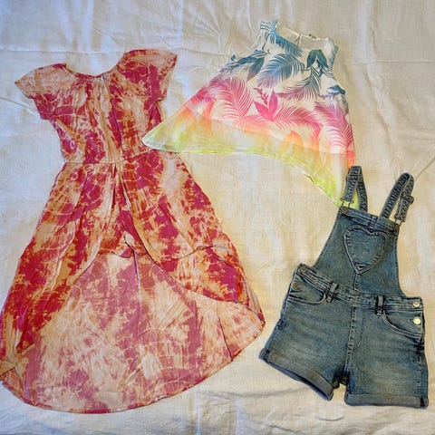 Klädpaket med kläder från Lindex och H&M med bl a en riktigt snygg jeanskjol, sommarpyjamas med ananastryck, underbar byxdress och en otroligt fin blus med tillhörande pullover.👌🏼🥹✨