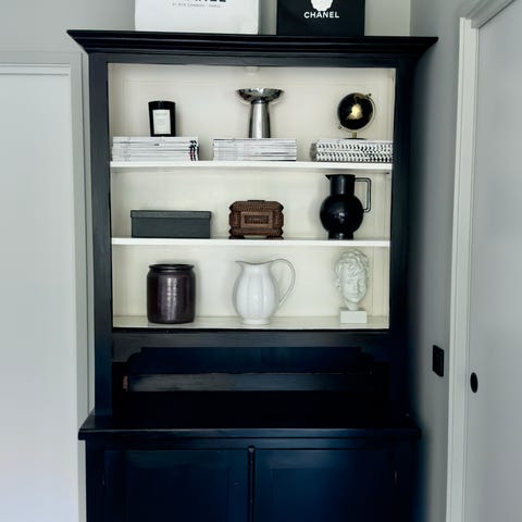 Fantastiskt vackert målat allmogeskåp som går i rött och grönt. Tror det är ett väggskåp / hängskåp, men vi har haft det stående på golvet. Det har en nyckel till och många gulliga fack inuti.