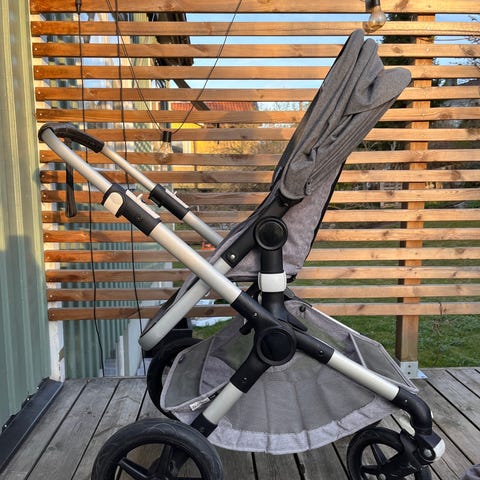 Bugaboo barnvagn med vändbar sittdel, ingår liggdel också, grå klädsel och svart chassi. Justerbart handtag med läderimitation och stor varukorg under vagnen.