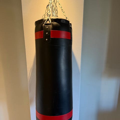 Boxningssäck från Budo-Nord i orange och svart med kedjor för upphängning. Stadig modell som funkar bra för både boxning och kickar hemma.