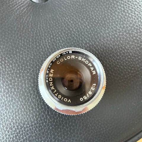 Schneider-Kreuznach Angulon 90mm storformatsobjektiv med Compur-slutare. Bländarring och slutartider ställs på ringen runt frontlinsen.