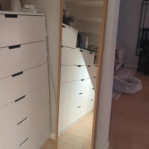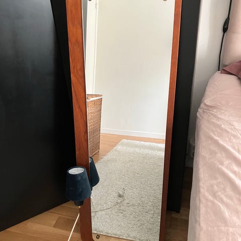 Superfin och rejäl helkroppsspegel i teak från 60-talet som vi inte har någon plats för längre. Inköpt på en vintagebutik för några år sen. Måtten är 122cm x 44cm och den är väldigt rejäl (och tung!). Stadig upphängning bak och både trä och spegelglas är i superfint skick!
