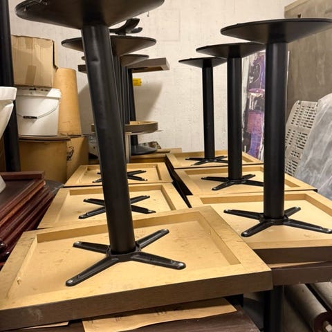 8 st Restaurang / cafébord med ljus marmorskiva och svart gjutjärnsfot. Passar bra för bar, restaurang, café eller utomhus på uteservering eller hemma.