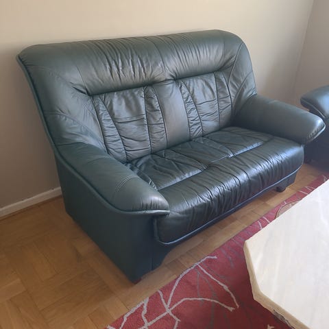 Gratis mot avhämtning, skön soffa i läder. Tyvärr har lädret spruckit litegrann som man ser på bild två.