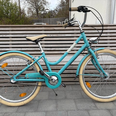 Barncykel av märket Ortler 24" i fint skick. Sparsamt använd. Lite ytlig rostfärg på några ställen då den stått ute en del, men det går att polera bort. I övrigt väldigt fin. Har endast använts av ett barn och är helt o-vurpad. 3 växlar, fotbroms och handbroms. Låset ingår ej.