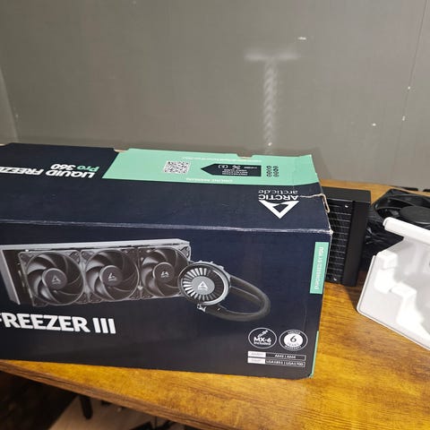 AIO är endast provad, köpt ny från Elgiganten Outlet i februari, kvitto finns. Den har en lätt intryckning på kylelementet som så klart inte påverkar kylningen och inte heller syns när sidopanelen är på plats (se bild).