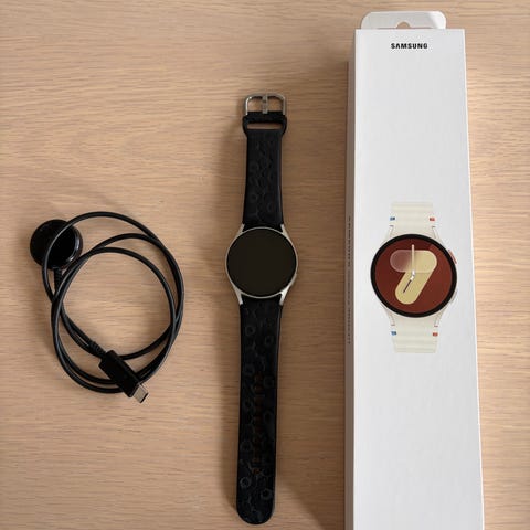 Samsung Galaxy Watch Active 2 i svart med rund pekskärm. Har silikonarmband och magnetisk laddare med USB-kabel.
