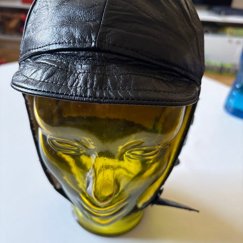 Svart lädermössa med liten skärm och öronlappar som går att knäppa under hakan. Har tryckknappar bak och detaljer i tyg vid öronen. AI-översikt