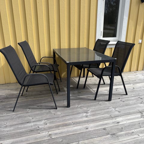 Äpplarö trädgårdsbord samt 6 klaffstolar med dynor. Parasoll och parasollfot ingår.