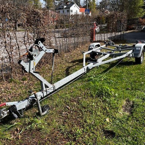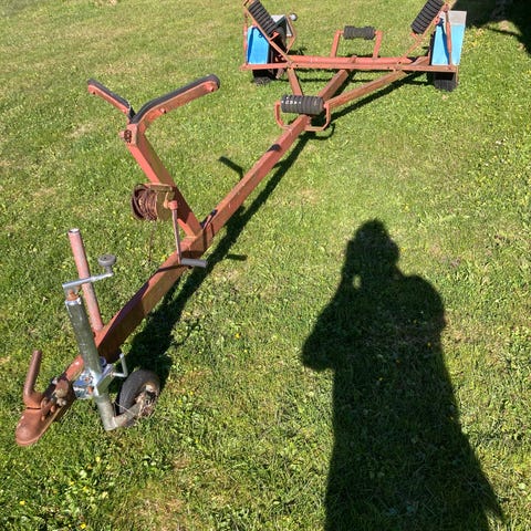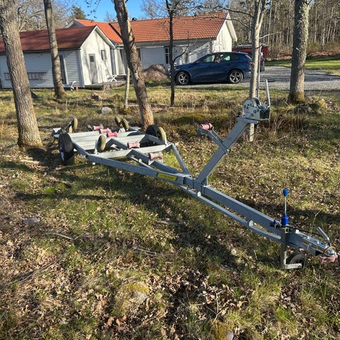 Båtvagn med manuell vinsch fram och rullar för att stödja båten.
