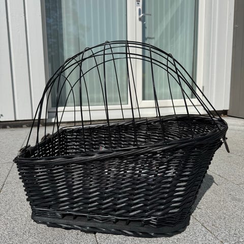Svart cykelkorg i flätad modell med högt galler runt om. Fästs med remmar och har en mjuk bottenplatta för hund eller annat smått att sitta på.