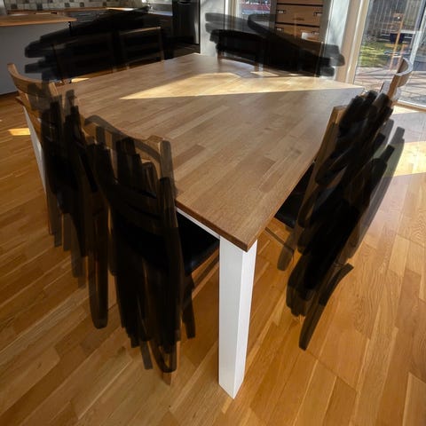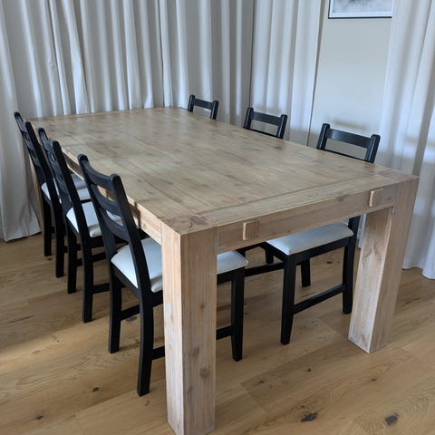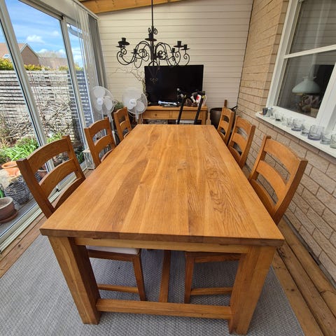 Säljer ett rejält och stilrent matbord i trä tillsammans med 6 bekväma stolar från Englesson. Perfekt för stora middagar och familjesammankomster.
