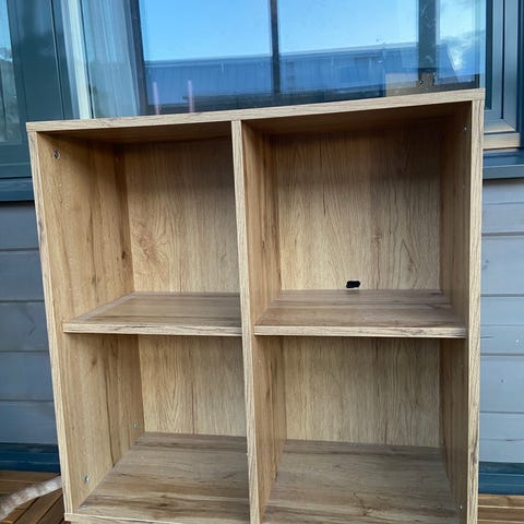 Ljusgrå hylla med ben i ljust trä, fint skick.