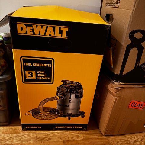 DeWalt DCV584L våt- och torrdammsugare i gult och svart med bärhandtag. Har slang upptill, frontlås och tydlig märkplåt med modellinfo.