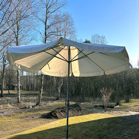 Parasoll ”Tornado” med tillhörande parasollfot från märket Skagerak (går nu under märket Fritz Hansen). Naturvit/teak och tung parasollfot i metall/betong.