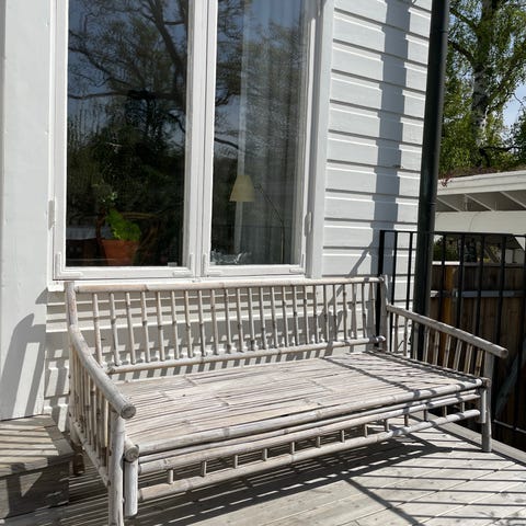 Vacker och skön soffa, som funkar fint men har gått sönder i det flätade materialet. Placera den smart och lägg i snygga kuddar så syns inte skadorna och du har en fin soffa för åtminstone en säsong till.