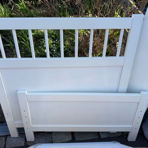 Vit sänggavel i trä med dekorativ överdel och frästa rutor på fronten. Har svarvade stolpar i sidorna och färdiga hål för montering mot sängram. Passar 180 säng.