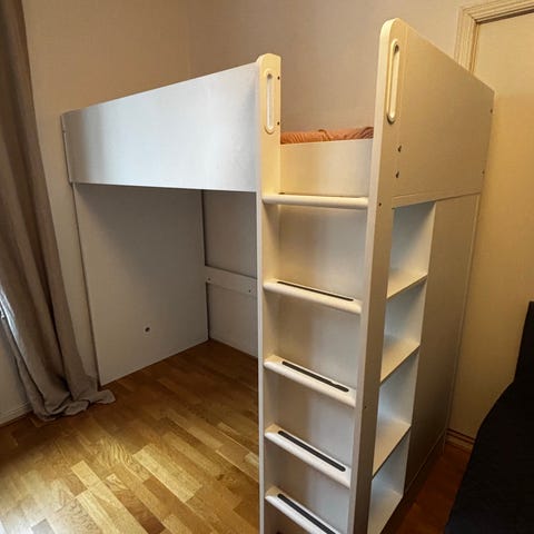 IKEA loftsäng (2 st)med stort skrivbord, hyllor och lådor under. Har även ett högt skåp på sidan och öppning i gaveln som ger lite kojskänsla. Bortskänkes mot amortering och hämtning.