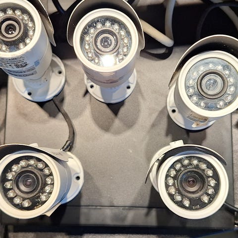 Två vita Tapo C200v3 övervakningskameror för inomhusbruk med svart front. Har vridbart kamerahuvud och kablar med nätadapter samt fästen som syns på bilden. Kan säljas separat för 200 kr/styck.