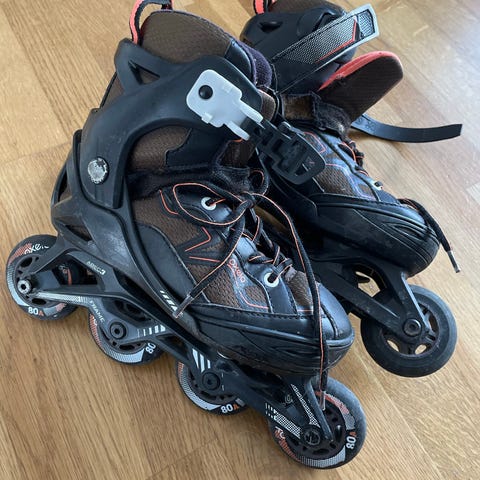 Inlines rullskridskor från Speed i svart med orange detaljer, barnstorlek stl 33. Justerbart spänne upptill, snörning och kardborreband över foten.