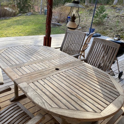Säljer en utegrupp med bord och fyra karmstolar från Mio. Serien heter Mölle och är i materialet teak. Bordet är 110 cm i diameter och 73 cm högt. Stolarna är 66 cm bredd, djup 57 cm och höjd 88 cm.