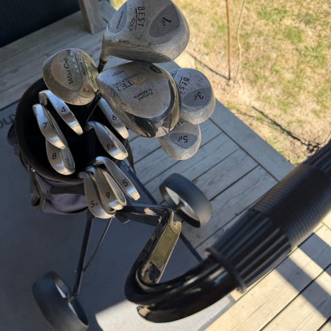 Håller på att rensa förrådet och hittar lite blandat. Flera golfklubbor säljes tillsammans med en svart bärbag med dragkedja. Klubborna har olika skaftfärger och grepp, bra för dig som vill ha ett enkelt set att spela med.