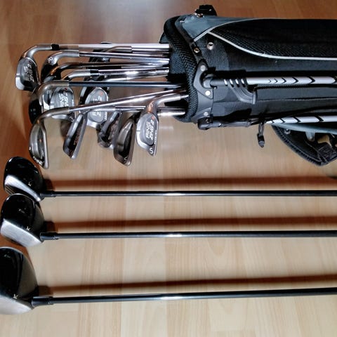 8 klubbor av märket Open varav en 5a, två 7or, 2 9or och tre övriga, samt golfbag av märket Sun Mountain