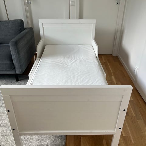 Säljer vår juniorsäng från IKEA med hög huvudgavel eftersom vårt barn samsover med oss och den knappt används. Madrass ingår, obehandlade fläckar finns på madrassen.