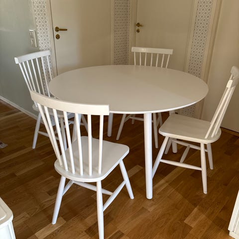MIO köksbord med fyra stolar. Vitmålad björk. Iläggsskiva följer också med. Måtten ovan är köksbordets.