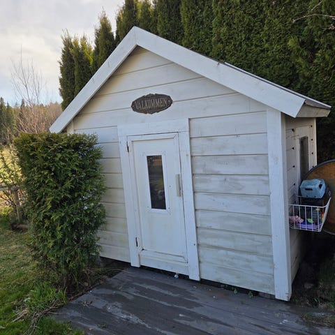 lektstuga i trä med liten veranda, fönster och dörrar. Använt skick. Hämtas av köpare, går lätt att komma åt med släp.