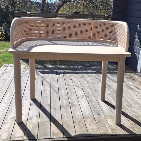 Skrivbord från Ellos Home (skrivbord Vessi ) med överdel i rotting och trä. Nypris 4499kr Vitlaserat och verkligen jättefint och använts endast för stajling och foto.