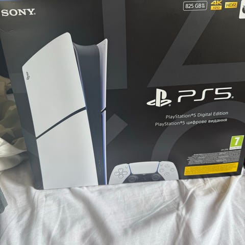 Sony PlayStation Portal Remote Player handhållen konsol i vitt med inbyggd skärm och kontroller på sidorna. Levereras i originalkartong med tydliga knappar och spakar liknande en DualSense.