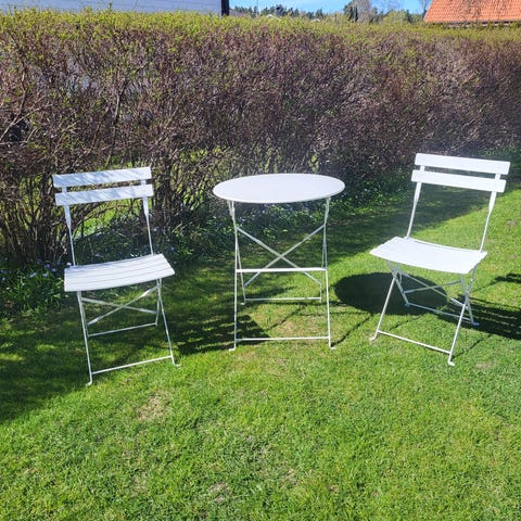 Smidigt hopfällbart caféset i trä med ett bord och tre stolar. Ribbad sits och bordsskiva, lätt att fälla ihop och ställa undan.