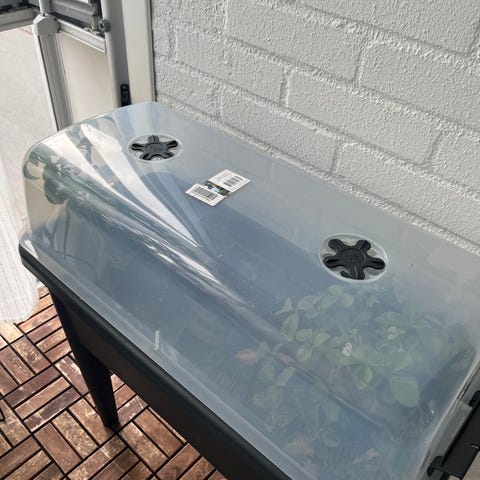 Odlingsbord med genomskinligt plastlock, bra för att dra upp plantor. Har ben som lyfter lådan från golvet och lock med två ventiler upptill. Köpt på Åhléns