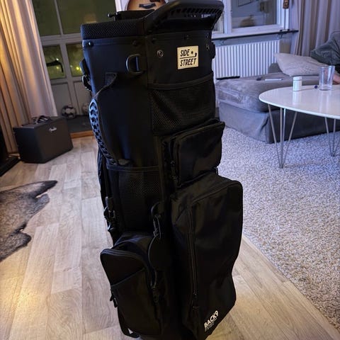 Maxfli golfbag med bärsele och ställben i svart med röda detaljer. Flera fack för klubbor och fickor på sidorna med dragkedjor.