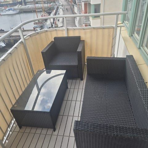 Svart konstrotting loungeset med två fåtöljer och en soffa, alla med vita sittdynor. Passar bra på balkong och har raka armstöd och flätad struktur i materialet. Använda men inga skador, endast lite dammiga. Vita dynorna är något fläckiga men går att ta av och förmodligen tvätta.