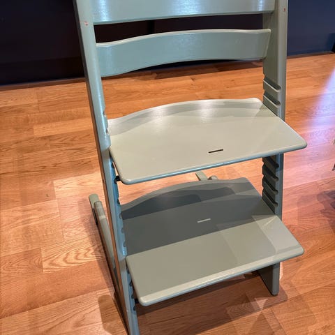 Grön Stokke Tripp Trapp matstol med justerbar sitt- och fotplatta. Har bygel, vit bricka och en blåmönstrad dyna som syns på bilderna.