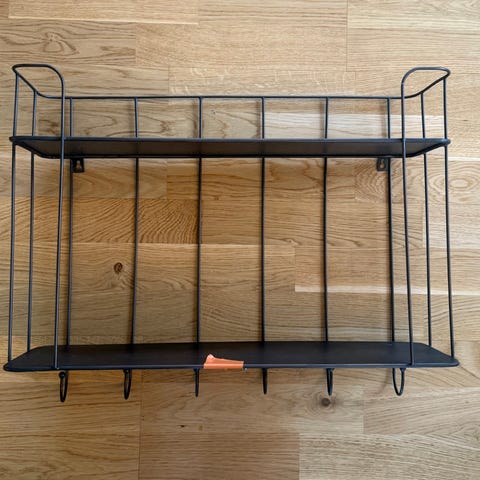 Vägghylla med krokar och spegel.