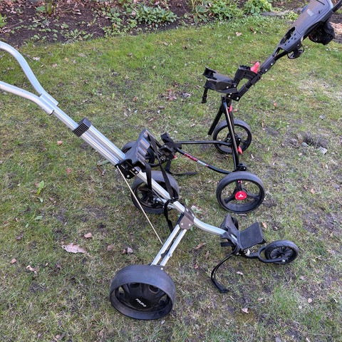 2 st tvåhjuliga golfvagnar använda 3 säsonger. Har hållare för bag, remmar och hjul som rullar lätt på banan. Bra skick och lätta. 150 kr/st eller 250 kr för bägge.